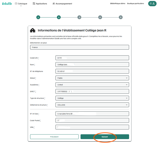 - Une fois votre établissement sélectionné parmi la liste ou référencé, passez à l'étape suivante :