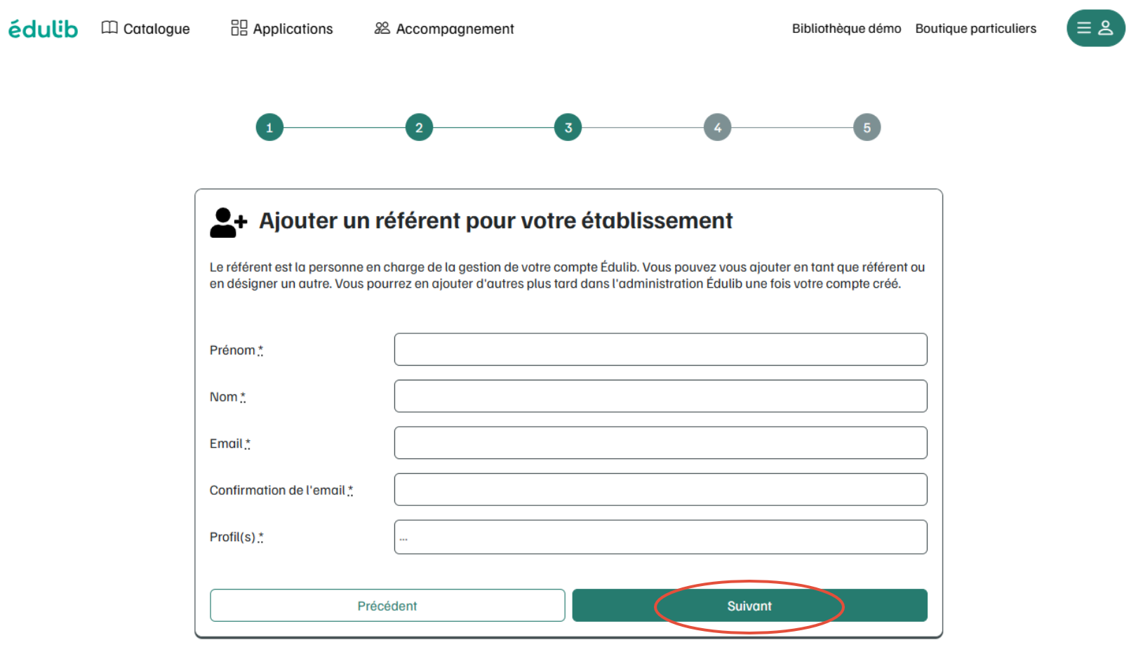 Renseignez maintenant vos informations personnelles afin de pouvoir créer votre accès en tant que référent Edulib du compte de l'établissement.
