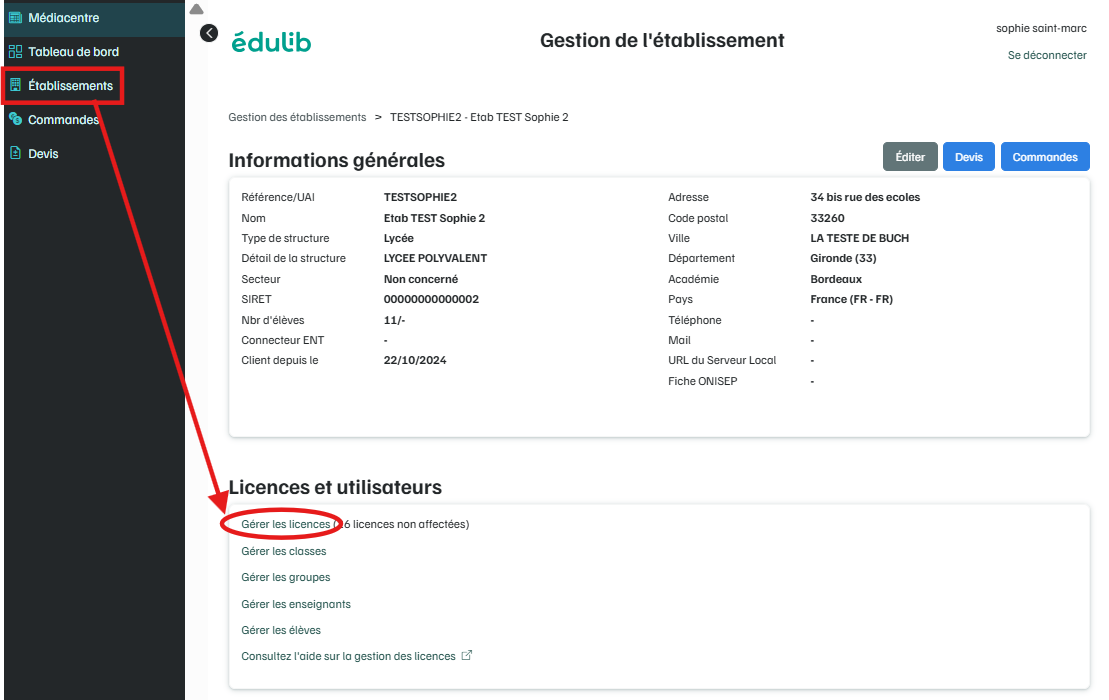Retournez sur la page de l'établissement, puis rendez-vous dans la rubrique Gérer les licences.