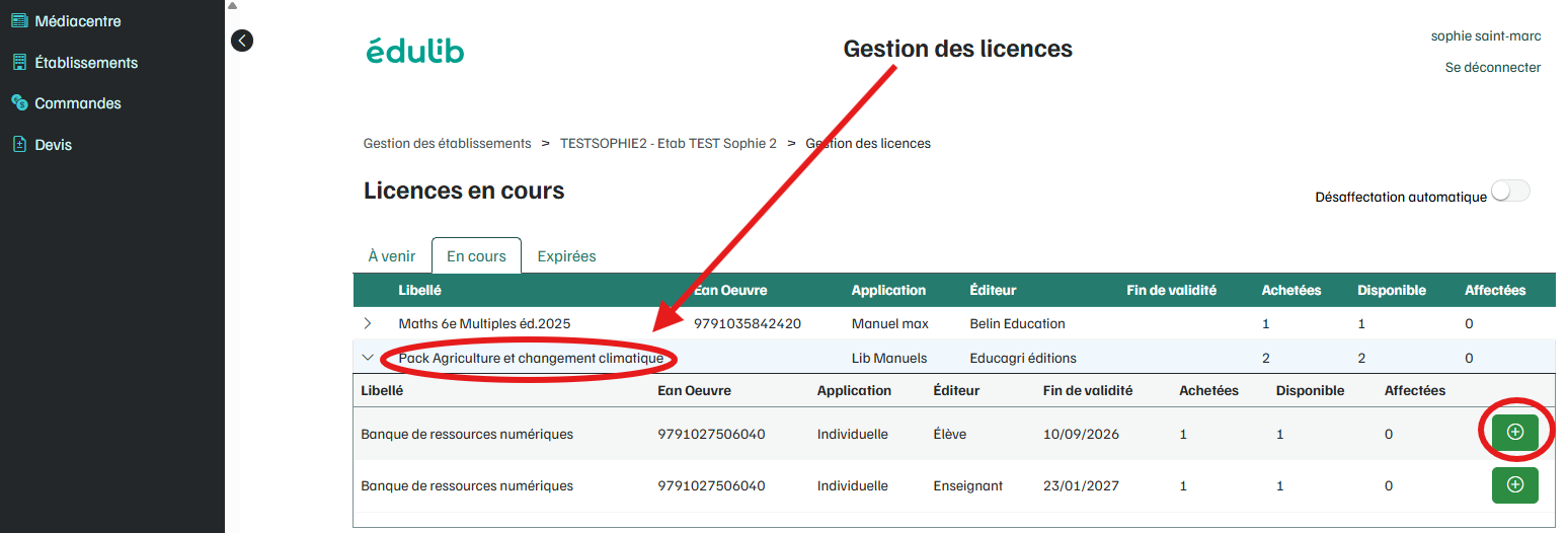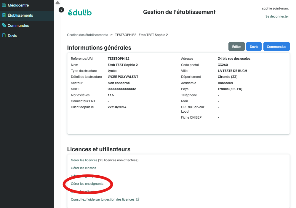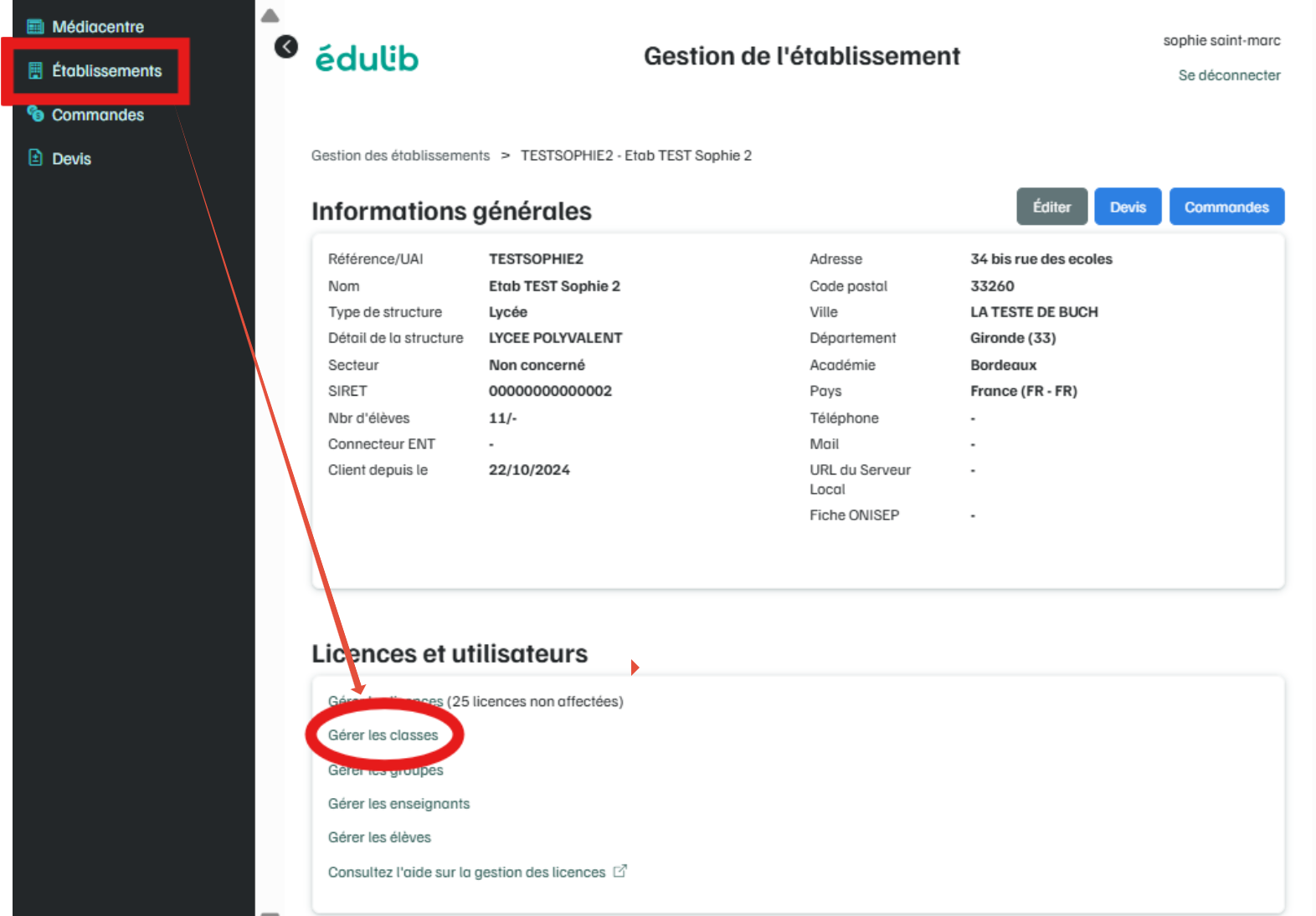 Retournez sur le compte de l'établissement, puis rendez-vous dans la rubrique Gérer les licences.