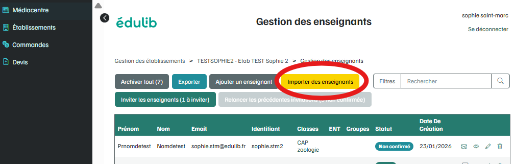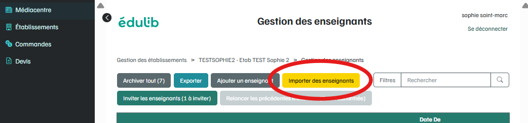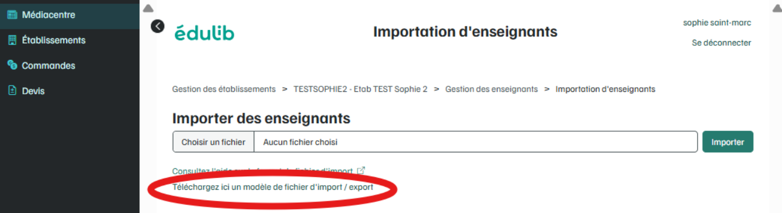 - Vous trouverez le modèle de fichier d'import enseignants dans la rubrique Gérer les enseignants : bouton "Importer des enseignants" > Téléchargez ici un modèle de fichier d'import/export