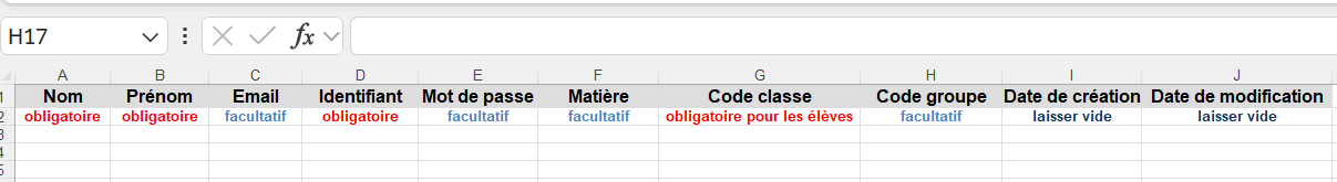Pour la création de compte enseignant, les colonnes suivantes sont obligatoires : Nom, Prénom, Identifiant.