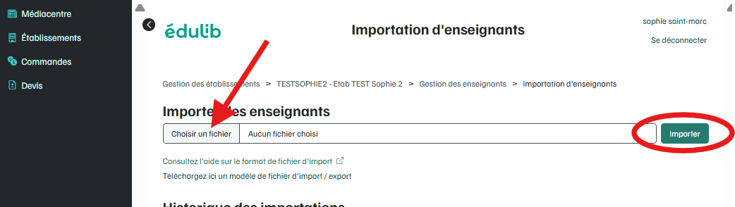 - Une fois votre fichier d'import complété et enregistré, retournez dans la rubrique Gérer les enseignants / Gérer les élèves, cliquez sur le bouton "Importer des enseignants"/ "Importer des élèves", puis importez votre fichier en cliquant sur Choisir un fichier