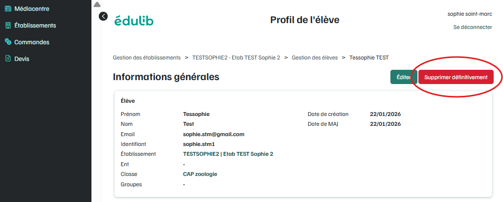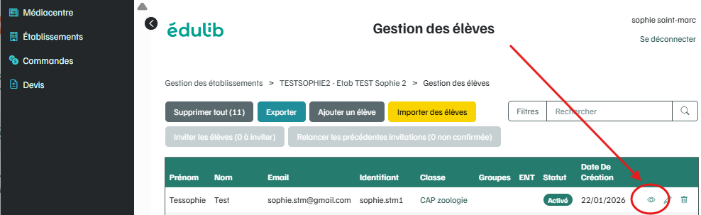 - Vous vous êtes trompé? Vous pouvez supprimer un élève : allez dans la Gestion des élèves > cliquez sur l'oeil à droite du nom de l'utilisateur : puis cliquez sur le bouton "Supprimer définitivement".