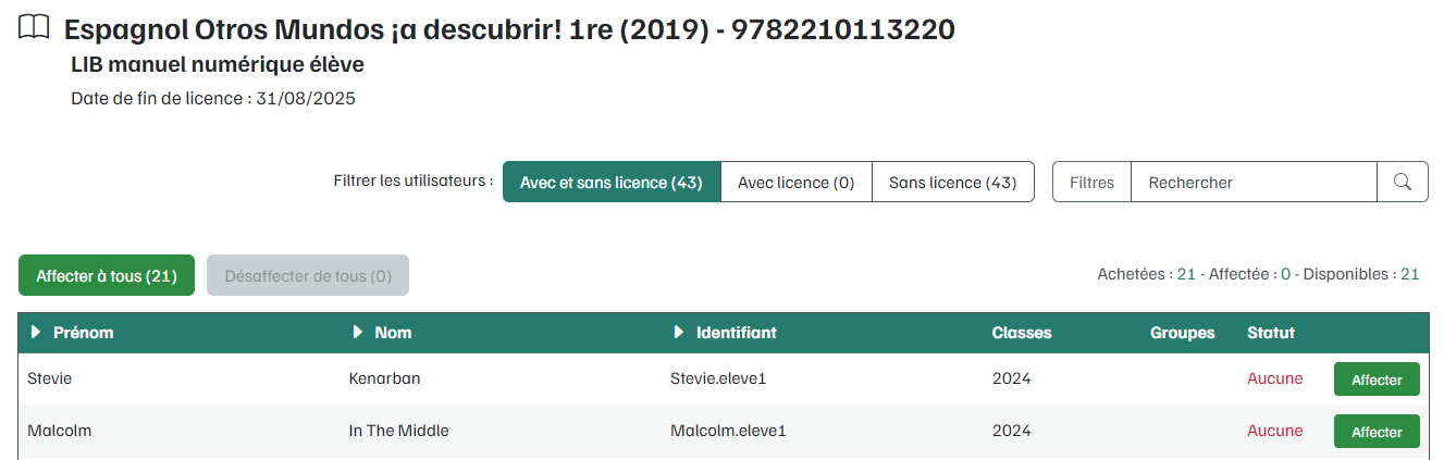 - Sélectionnez les élèves ou les enseignants à qui vous souhaitez affecter ce titre en cliquant sur Affecter. N'hésitez pas à filtrer la liste d'enseignants ou d'élèves par classe pour les sélectionner plus facilement.