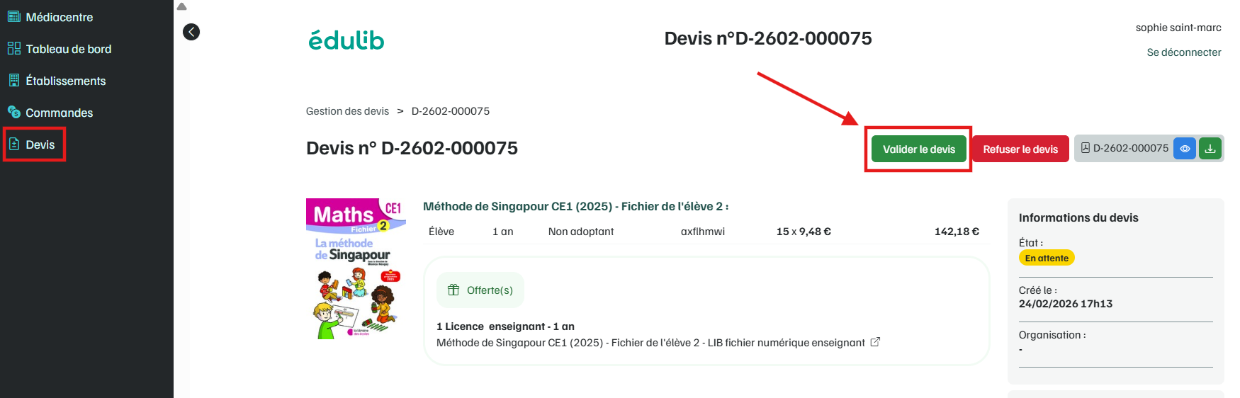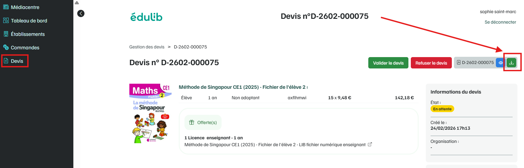 Si vous êtes enregistré.e comme référent.e sur le compte Edulib de votre établissement, vous pouvez générer un devis au format PDF depuis votre compte, et le valider pour déclencher la livraison et la facture.