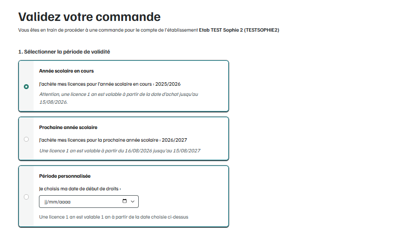C'est sur la page "Validation de commande" que vous pourrez configurer la date de début de validité de licence ou ajouter le numéro d'engagement pour Chorus Pro.