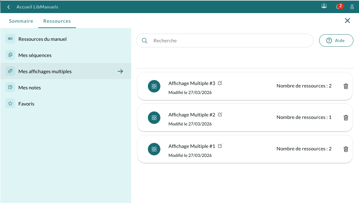 1. Ouvrez le menu "Ressources" de LibManuels depuis l'onglet en haut à gauche puis le sous-menu "Mes affichages multiples".